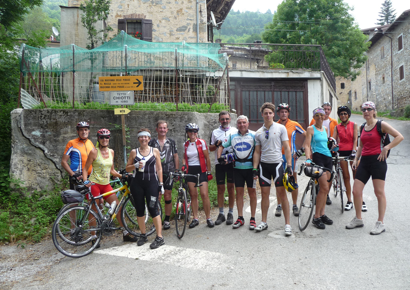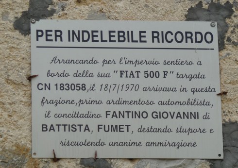 Il gruppetto di ciclisti arrivato a Chiotti di Roaschia e la simpatica iscrizione che ricorda l’impresa di un abitante della piccola borgata