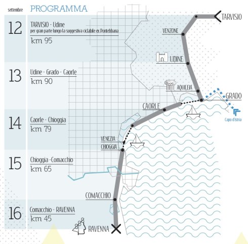 4) Più a noi conosciuto l’ultimo tratto nel Delta del Po, che presenta ancora delle difficoltà ( è purtroppo inevitabile fare un pezzetto della pericolosissimastrada statale. Romea per attraversare il ponte sul Po): interessante perché si attraversano tanti famosi e meno famosi fiumi, il Piave, l’Adige, il Po, il Reno, il Lamone