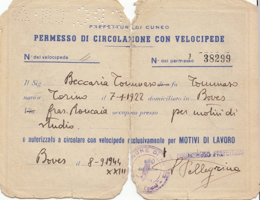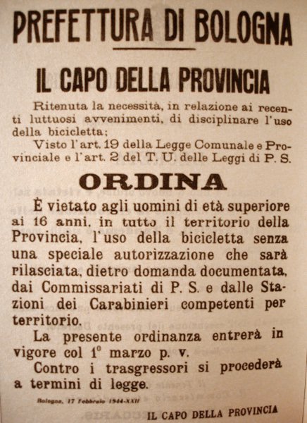 Allegati a questo articolo: un manifesto della prefettura di Bologna che vieta la circolazione in bicicletta (17/02/1944) e un permesso di circolazione in velocipede rilasciato dalla prefettura di Cuneo (8/09/1944). Quest’ultimo permesso fu ottenuto – sotto falso nome – da un giovane partigiano che lo utilizzò per spostarsi in bci tra Boves, Cuneo e Borgo San Dalmazzo.