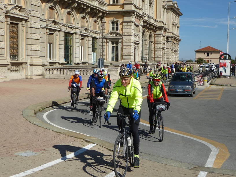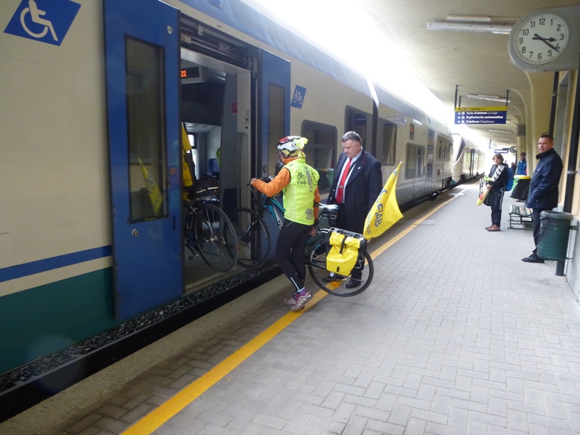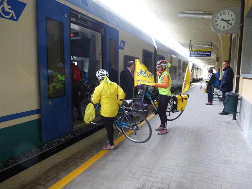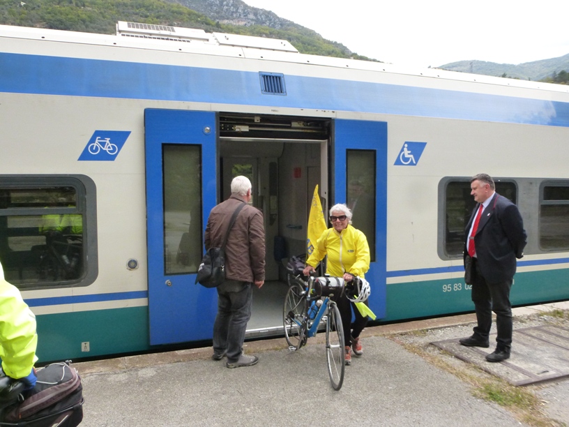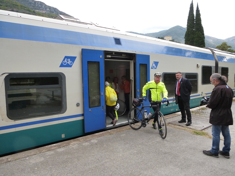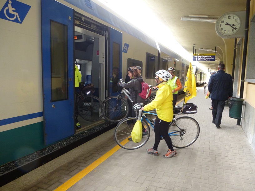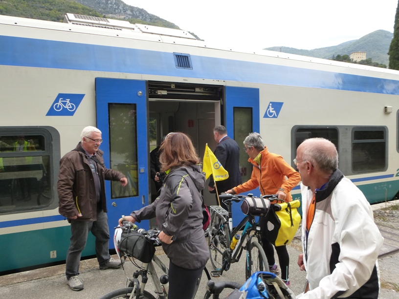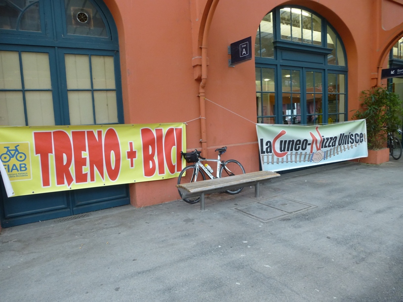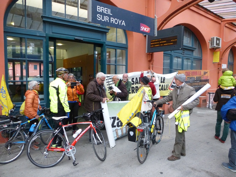 La pedalata aveva lo scopo di richiamare ancora una volta l’attenzione sulla possibilità di usufruire ora e anche in futuro del treno per Ventimiglia non solo come passeggeri, ma come passeggeri con bici al seguito. Giunti alla stazione di Limone abbiamo aspettato il treno partito da Cuneo e alcuni di noi sono saliti con la bici fino a Breil. A disposizione dei ciclisti le ferrovie hanno predisposto un minuetto in più (ultimamente la linea era percorsa solo da 1 minuetto). Una meraviglia: avevamo a disposizione un intero convoglio per le nostre bici, fosse sempre così…