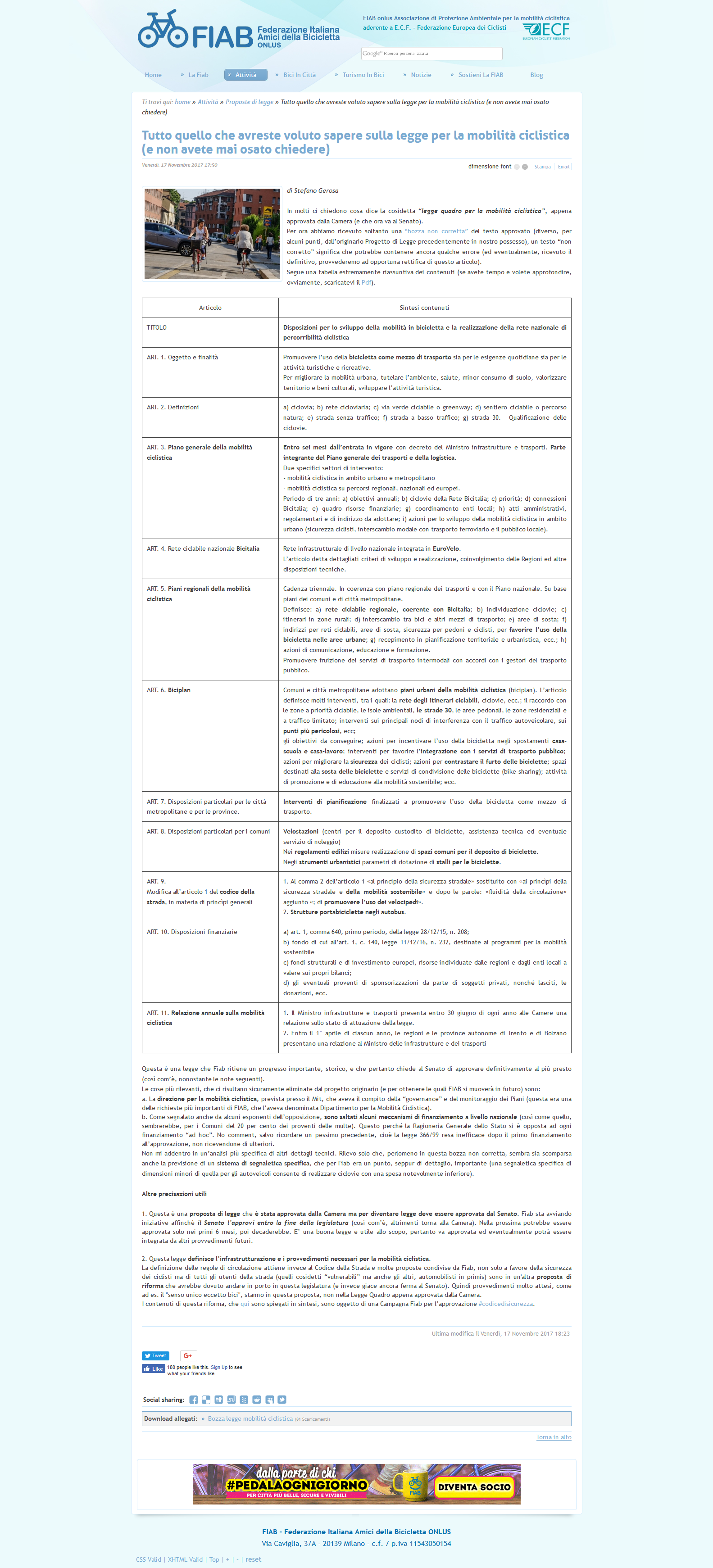 Pubblichiamo la scheda della Fiab sulla Legge Quadro sulla MObilità Ciclistica, approvata dalla Camera e in attesa di definitiva approvazione del Senato. (cliccare sull’immagine per ingrandirla)