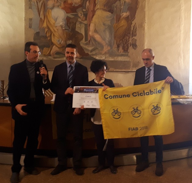 Attualmente sono 69 comuni italiani a cui è stata assegnata la bandiera gialla. Sette di essi hanno ottenuto il punteggio massimo e tra questi vi sono tre capoluoghi di provincia (Cesena, Ferrara e Pesaro). Il comune di Cuneo ha partecipato a questa edizione e ha ottenuto il punteggio di tre smile (nella foto sotto l’assessore Davide Dalmasso e il dirigente Luca Gautero, del settore mobilità del Comune di Cuneo, mentre ricevono a Bologna la bandiera gialla dalla presidente FIab Giuluetta Pagliaccio). È un riconoscimento alle iniziative adottate negli ultimi anni dall’amministrazione comunale in questo settore (da notare che in Piemonte solo Torino e altri due piccoli comuni hanno aderito a questo progetto ed hanno ottenuto la bandiera gialla) e uno stimolo per ulteriori progressi nel futuro.