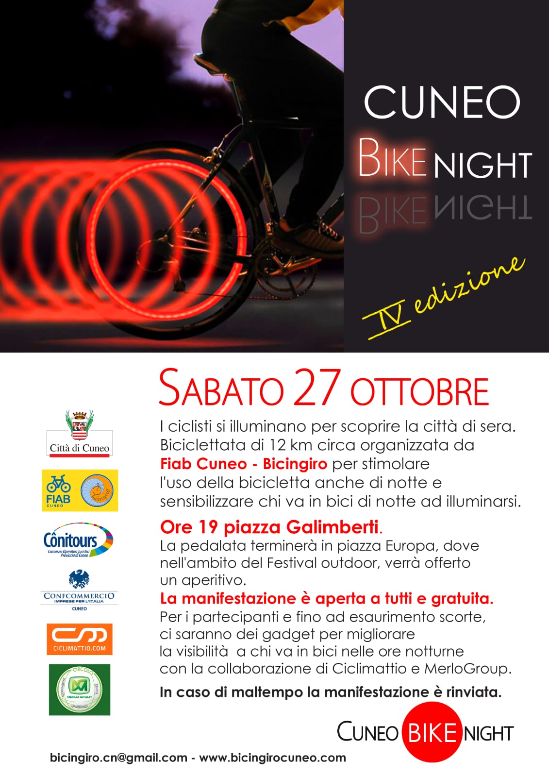 Sabato 27 ottobre si svolgerà la quarta edizione di CUNEO BIKE NIGHT, pedalata in notturna che vuole stimolare l’uso della bicicletta anche di notte e sensibilizzare i ciclisti ad illuminarsi in modo adeguato.