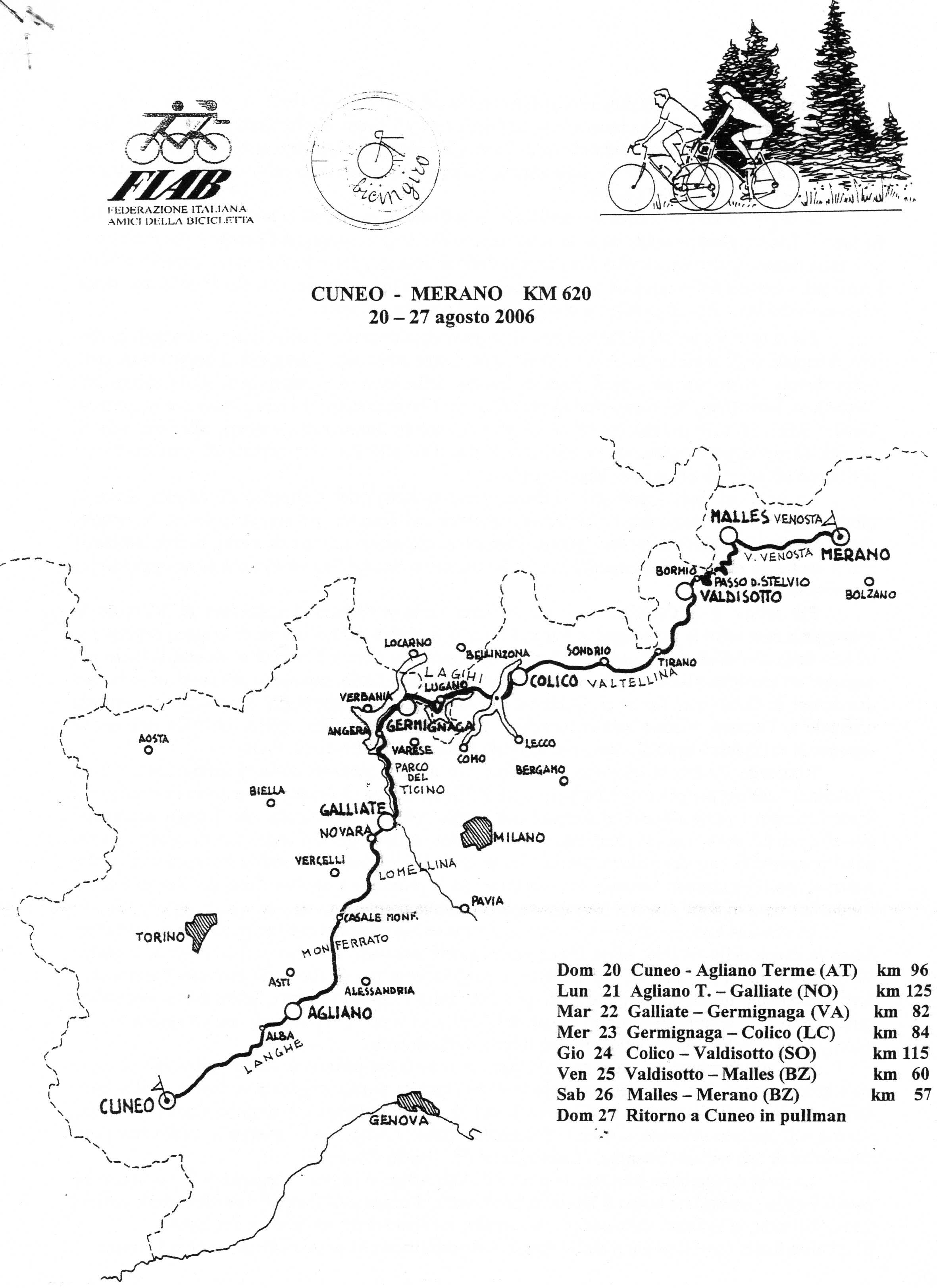 Le tappe sono descritte nel documento PDF con il dettaglio delle distanze, dei profili altimetrici, delle notizie sulle località attraversate, delle sistemazioni in campeggio.
