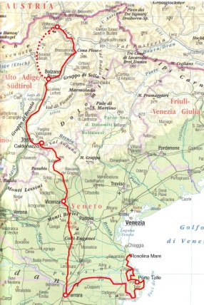 Le tappe sono descritte nel documento PDF con il dettaglio delle distanze, dei profili altimetrici, delle notizie sulle località attraversate, delle sistemazioni in campeggio e in albergo. Al momento della effettiva realizzazione il percorso ha subito alcune modifiche soprattutto nella parte finale, nella zona del delta del Po.